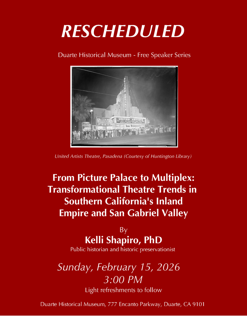 February 20, 2:30-3:30 p.m. at the Duarte Historical Museum, at 777 Encanto Parkway in Duarte. Admission is free. Space is limited.